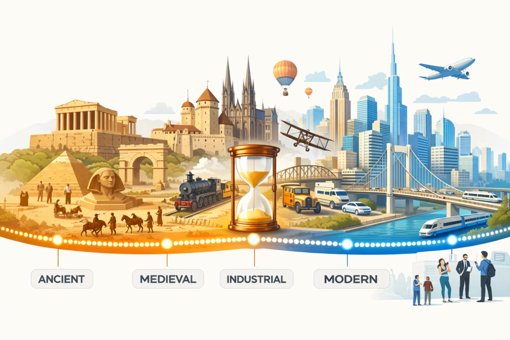 Ancient history marks the beginning of human civilization, starting around 3000 BCE with the invention of writing. Early societies formed near rivers, where farming supported large populations and the growth of cities.